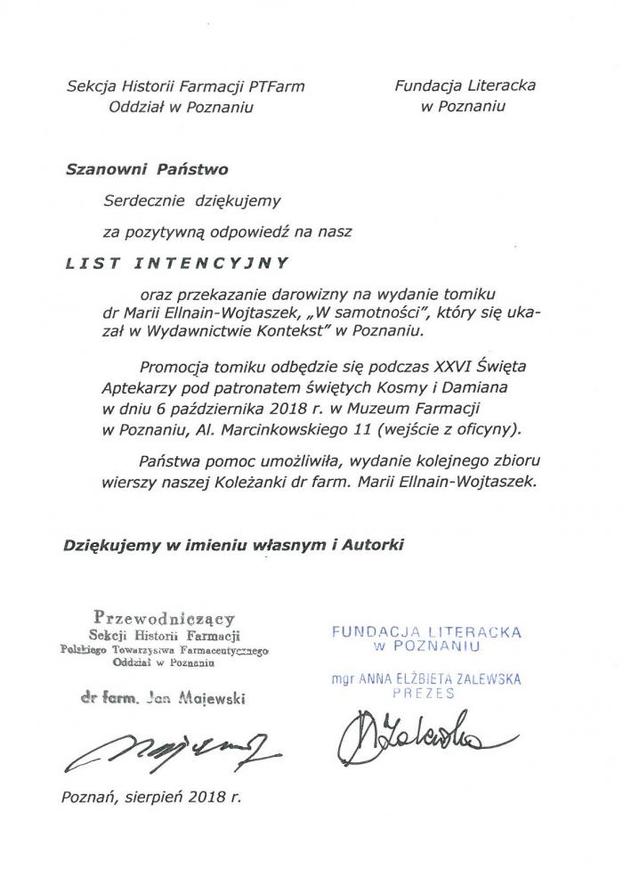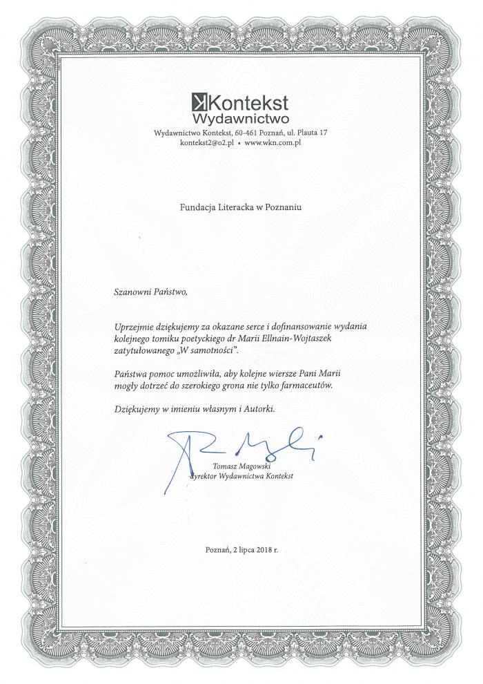 Państwa pomoc umożliwiła, wydanie kolejnego zbioru wierszy naszej Koleżanki dr farm. Marii Ellnain-Wojtaszek.